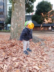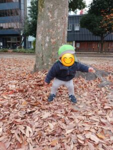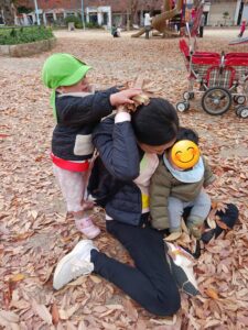 「きゃー!」と驚く保育士にへへへーと嬉しそうな顔
